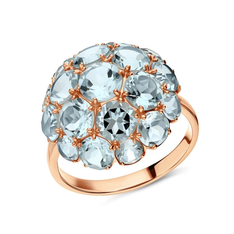 Кольцо с 6 топазами скай, 3.53 карат, тип огранки В;6 топазами скай, 2.695 карат, тип огранки В;6 топазами скай, 1.3 карат, тип огранки В;1 топазом скай, 0.745 карат, тип огранки В; Розовое золото 585 пробы.