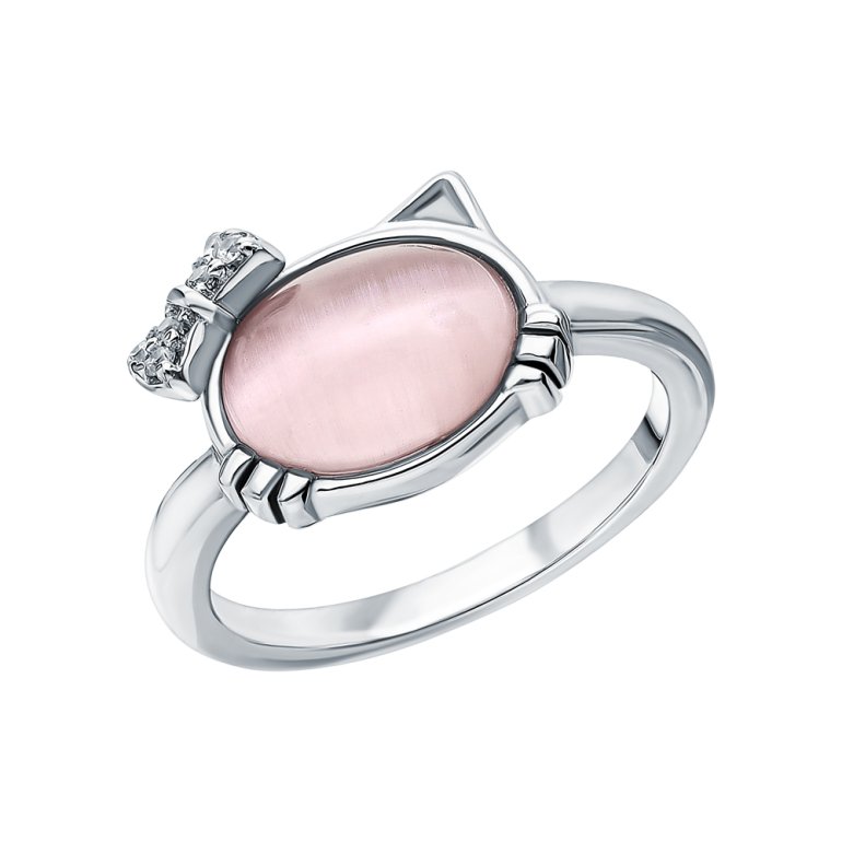 Кольцо, вставка: кошачий глаз розовый синт.;  фианитом бесцветным; Серебро 925 пробы.