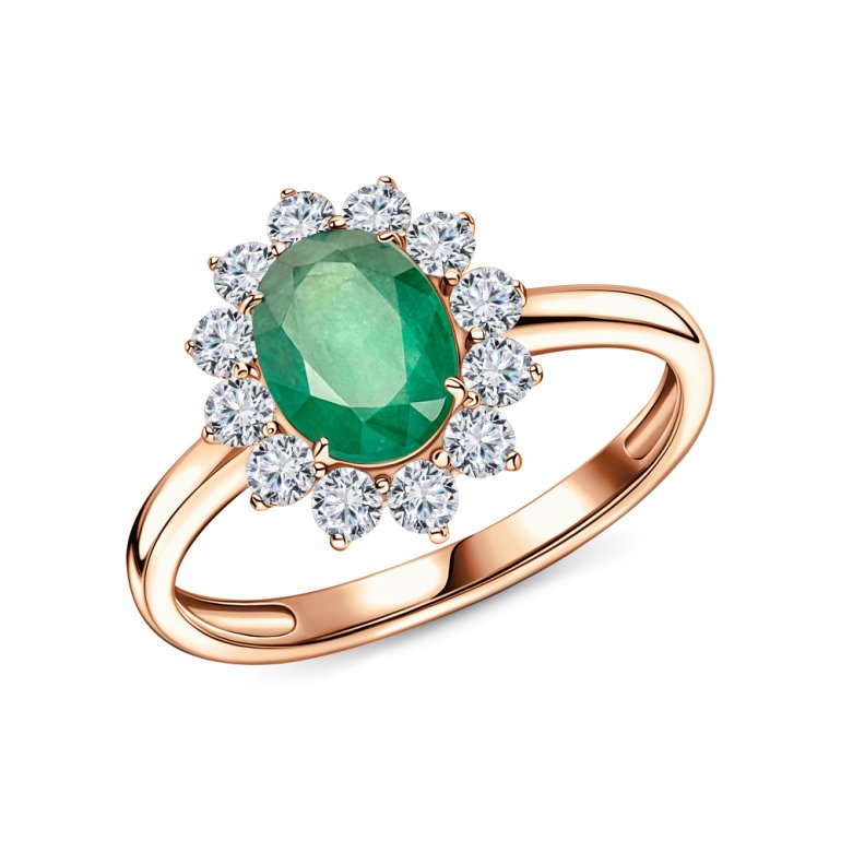 Кольцо с 12 бриллиантами природными, 0.49 карат, огранка круг 57 граней, цвет 3, чистота 7, тип огранки А; 1 изумрудом природным, 0.98 карат, цвет 3, чистота 3, тип огранки Б; Розовое золото 585 пробы.