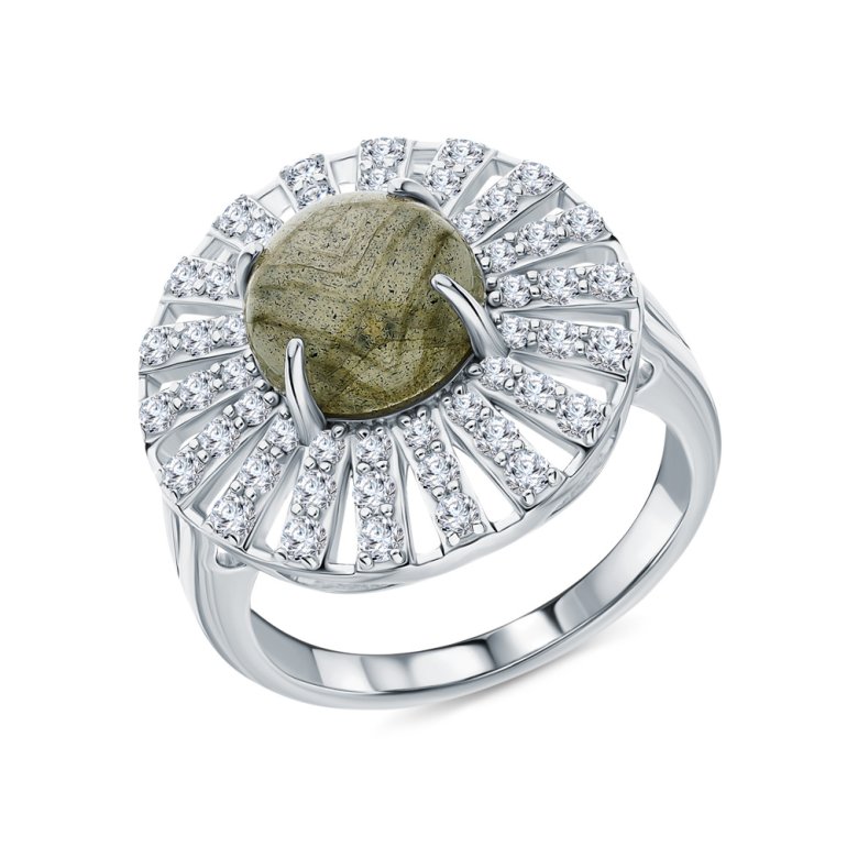 Кольцо с 1 лабрадоритом; фианитом бесцветным; Серебро 925 пробы.