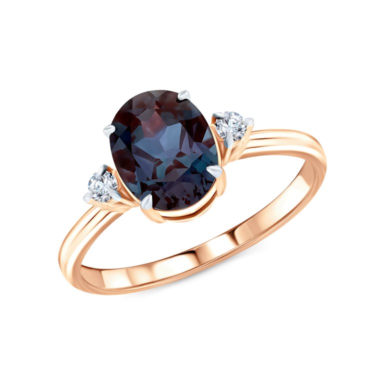 Кольцо с 1 александритом синтетическим, 1.48 карат, тип огранки Б; 2 бриллиантами, 0.057 карат, огранка круг 57 граней, цвет 3, чистота 6, тип огранки А; Розовое золото 585 пробы.
