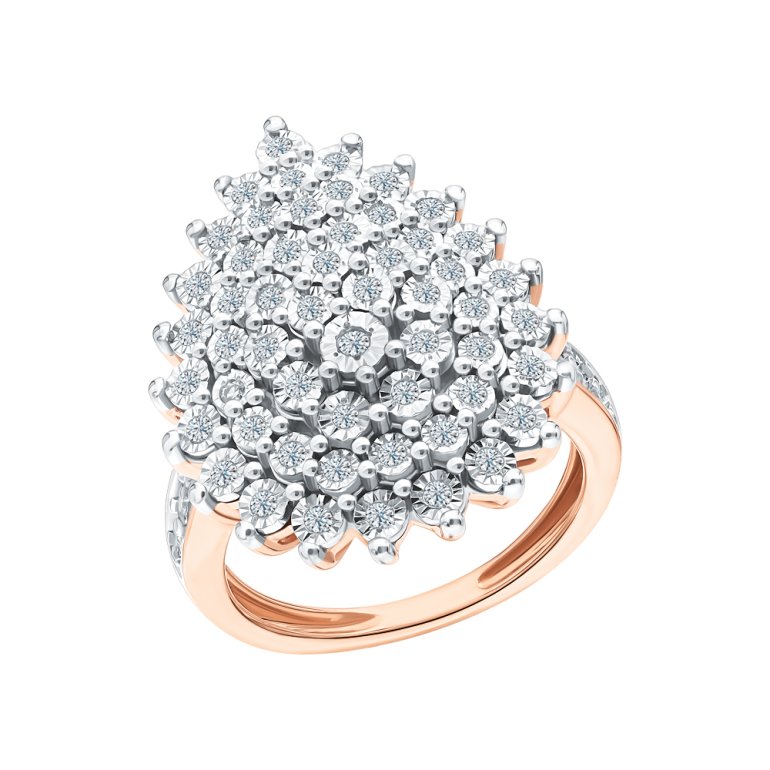 Кольцо с 1 бриллиантом природным, 0.009 карат, огранка круг 17 граней, цвет 2, чистота 2, тип огранки А; 59 бриллиантами природными, 0.281 карат, огранка круг 17 граней, цвет 2, чистота 2, тип огранки Б; Розовое и белое золото 585 пробы.