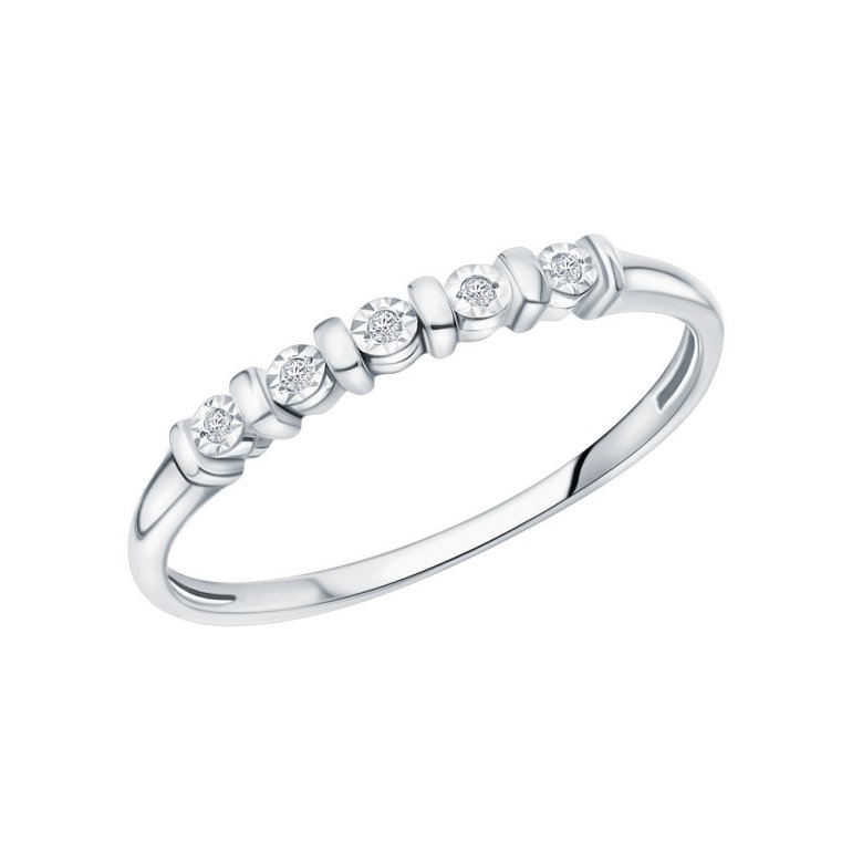 Кольцо с 5 бриллиантами, 0.023 карат, огранка круг 17 граней, цвет 2, чистота 2, тип огранки Б; Белое золото 585 пробы.