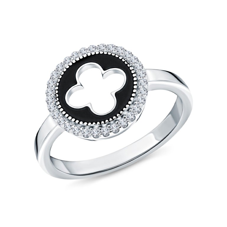 Кольцо, вставка: фианитом бесцветным;  эмаль черная; Серебро 925 пробы.