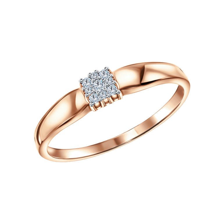 Кольцо с 1 бриллиантом, 0.019 карат, огранка круг 57 граней, цвет 4, чистота 6, тип огранки А; 4 бриллиантами, 0.034 карат, огранка круг 57 граней, цвет 4, чистота 6, тип огранки А; 4 бриллиантами, 0.014 карат, огранка круг 17 граней, цвет 2, чистота 2, тип огранки А; Розовое золото 585 пробы.