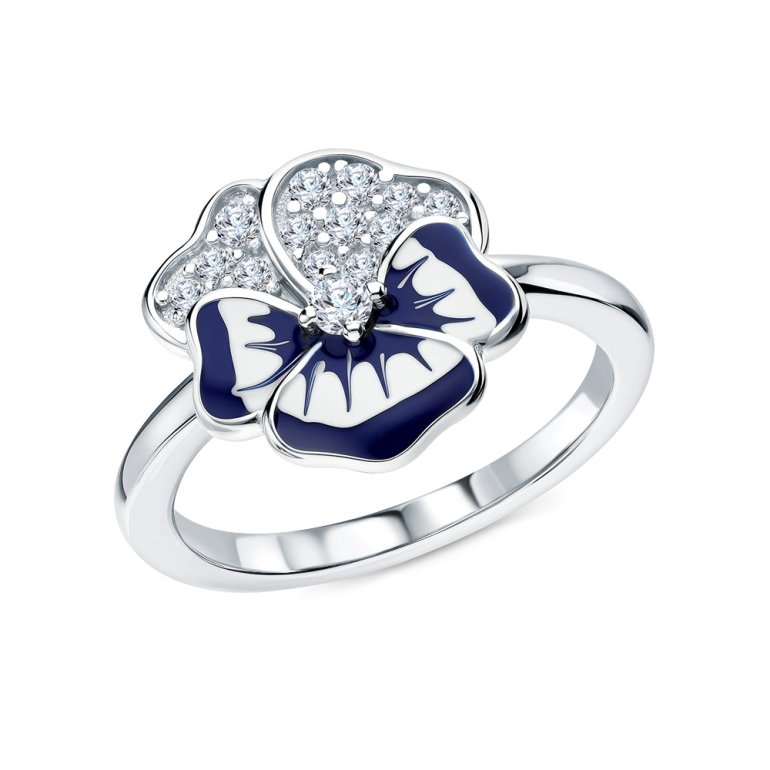 Кольцо, вставка: эмаль синяя;  эмаль белая;  фианитом бесцветным; Серебро 925 пробы.