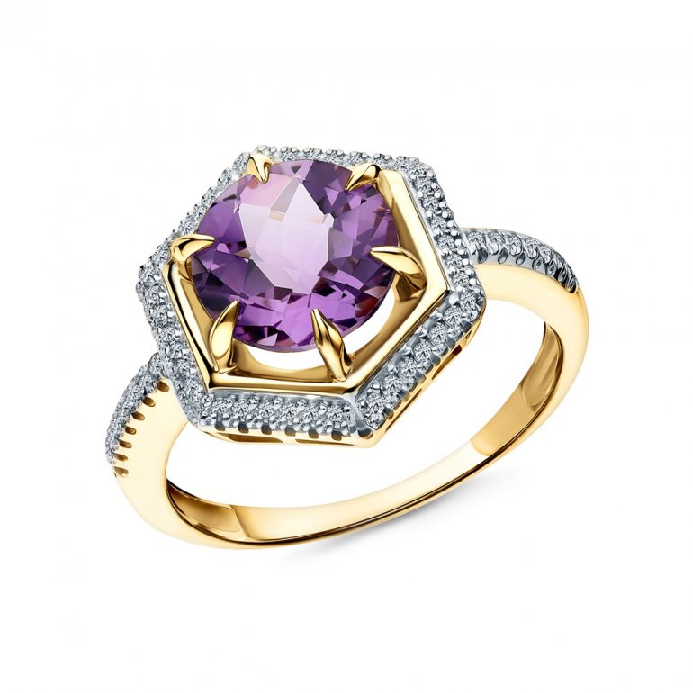 Кольцо с 56 бриллиантами природными, 0.118 карат, огранка круг 17 граней, цвет 2, чистота 2, тип огранки А; 1 аметистом природным, 1.534 карат, тип огранки Б; Желтое золото 585 пробы.