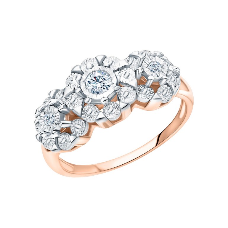 Кольцо с 1 бриллиантом природным, 0.077 карат, огранка круг 57 граней, цвет 3, чистота 6, тип огранки А; 2 бриллиантами природными, 0.024 карат, огранка круг 57 граней, цвет 3, чистота 6, тип огранки А; Розовое и белое золото 585 пробы.