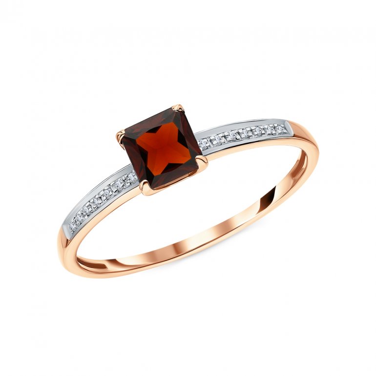 Кольцо с 14 бриллиантами природными, 0.03 карат, огранка круг 17 граней, цвет 2, чистота 2, тип огранки А; 1 гранатом природным, 0.837 карат, тип огранки Б; Розовое золото 585 пробы.