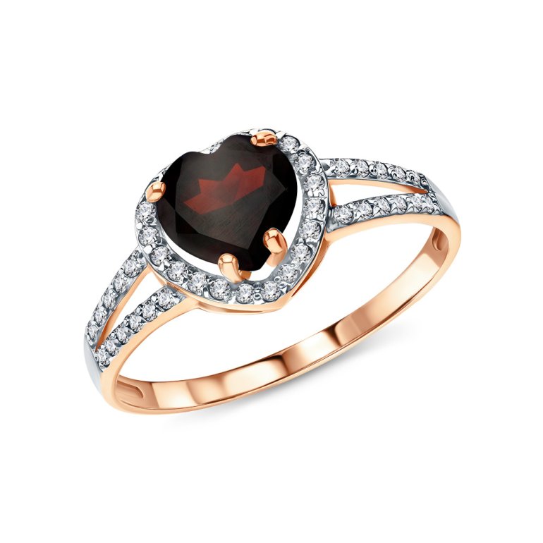 Кольцо с 1 гранатом природным, 1.395 карат, тип огранки Б; фианитом бесцветным; Розовое золото 585 пробы.