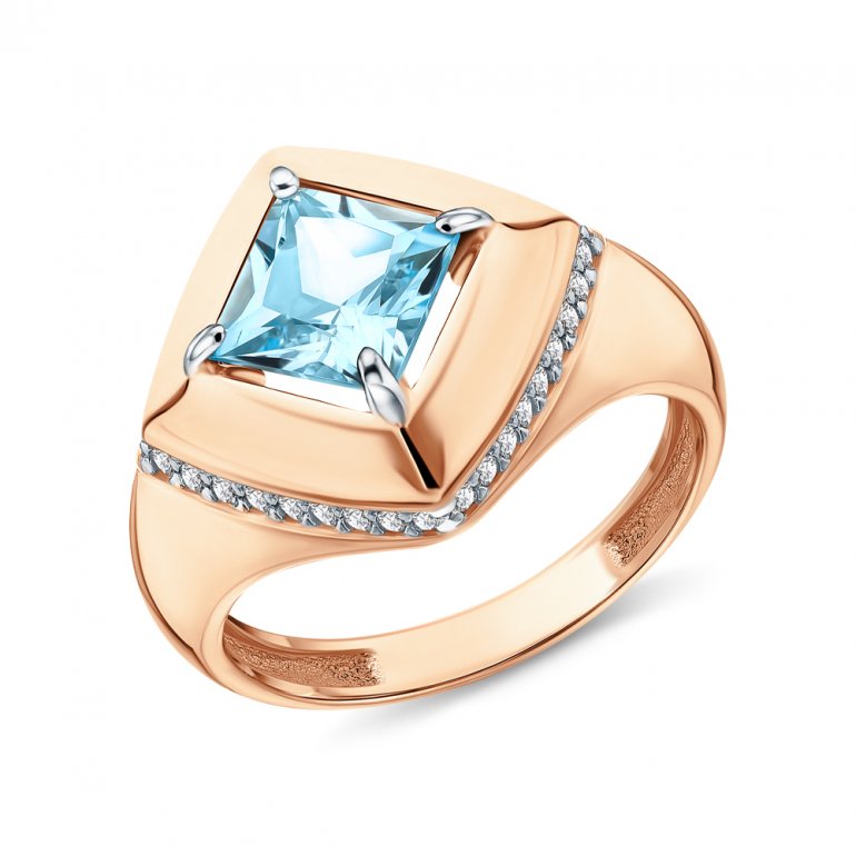 Кольцо с 1 топазом скай, 1.25 карат, тип огранки Б; фианитом бесцветным; Розовое золото 585 пробы.