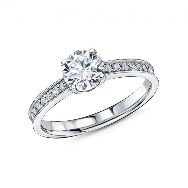 Кольцо с 1 бриллиантом выращенным, 0.752 карат, огранка круг 57 граней, цвет 3, чистота 5, тип огранки А; 18 бриллиантами выращенными, 0.141 карат, огранка круг 57 граней, цвет 2, чистота 4, тип огранки А; Белое золото 585 пробы.