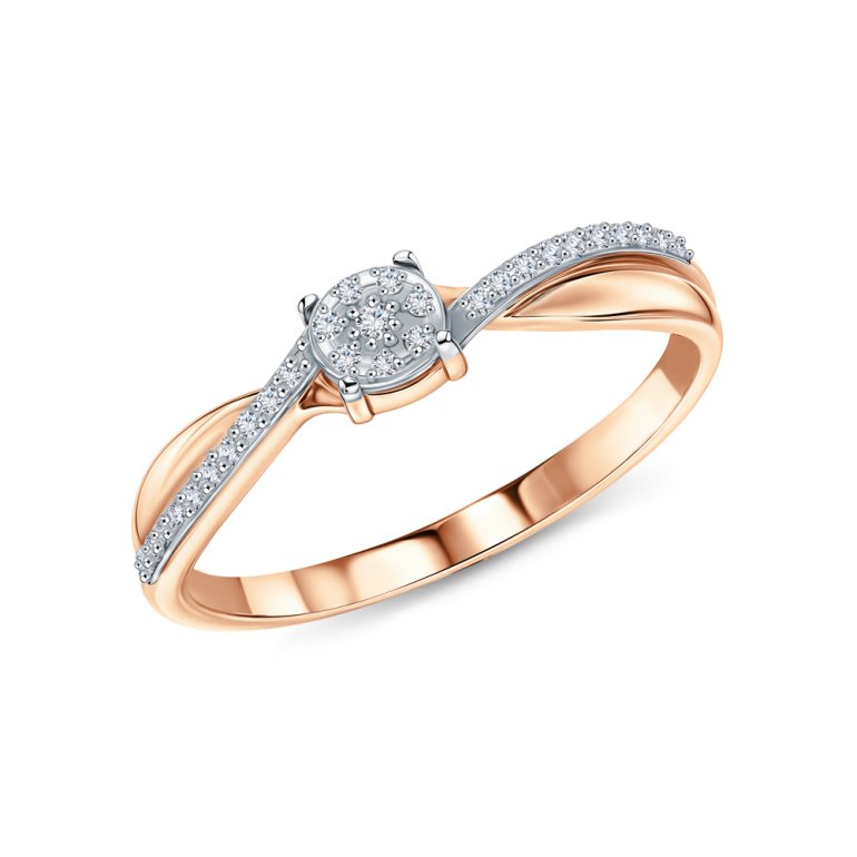 Кольцо с 1 бриллиантом природным, 0.008 карат, огранка круг 57 граней, цвет 3, чистота 6, тип огранки А; 27 бриллиантами природными, 0.058 карат, огранка круг 17 граней, цвет 2, чистота 2, тип огранки А; Розовое золото 585 пробы.