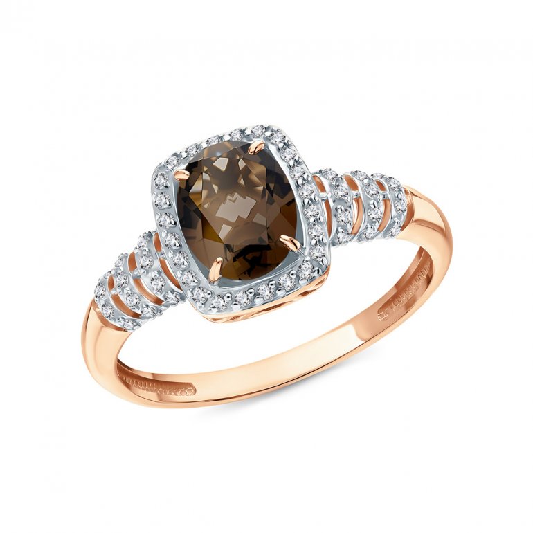 Кольцо с 1 кварцем дымчатым природным, 1.159 карат, тип огранки Б; фианитом бесцветным; Розовое золото 585 пробы.