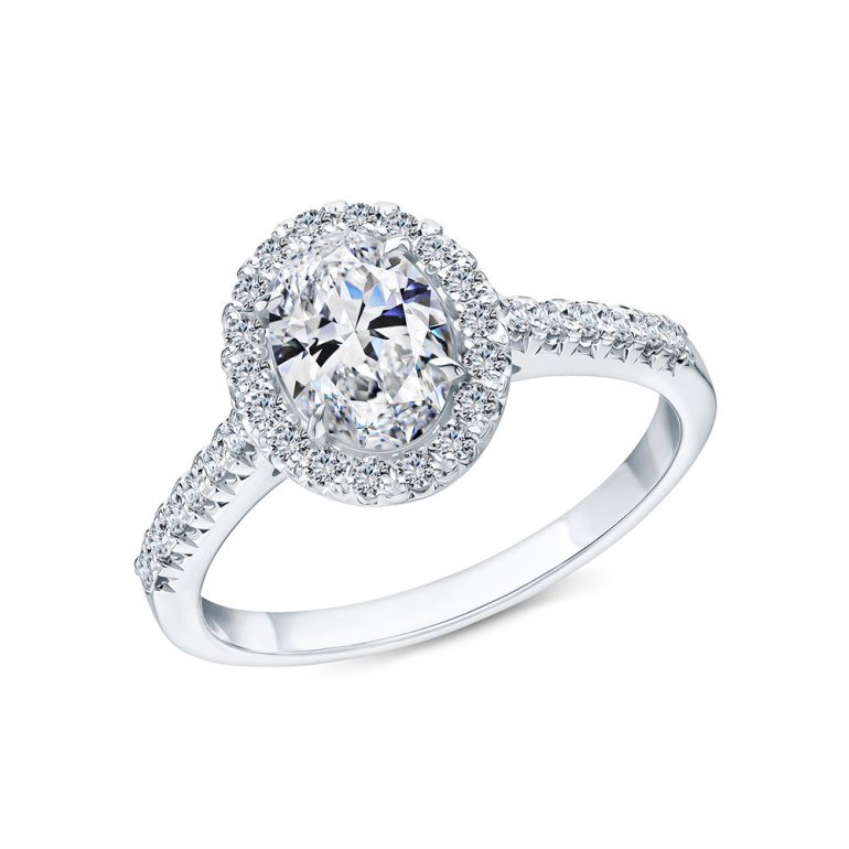 Кольцо с 1 бриллиантом выращенным, 0.863 карат, огранка овал 57 граней, цвет 3, чистота 5, тип огранки А; 30 бриллиантами выращенными, 0.235 карат, огранка круг 57 граней, цвет 2, чистота 4, тип огранки А; Белое золото 585 пробы.