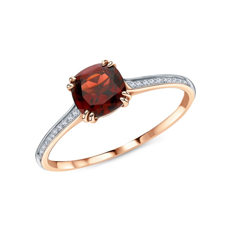 Кольцо с 1 гранатом, 1.648 карат, тип огранки Б; 12 бриллиантами, 0.05 карат, огранка круг 17 граней, цвет 2, чистота 2, тип огранки А; 12 бриллиантами, 0.03 карат, огранка круг 17 граней, цвет 2, чистота 2, тип огранки А; Розовое золото 585 пробы.