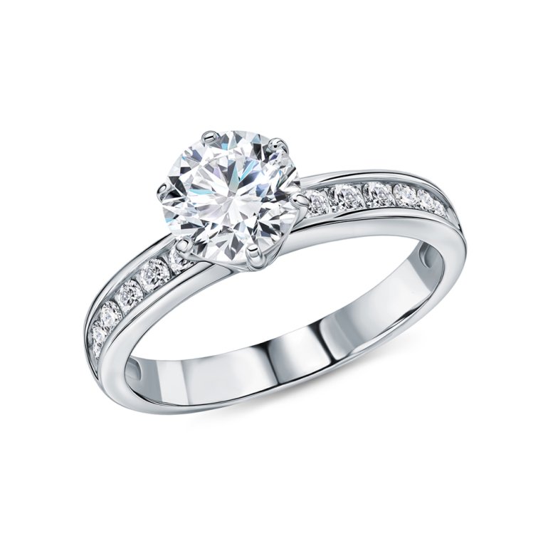 Кольцо с 1 бриллиантом выращенным, 1.09 карат, огранка круг 57 граней, цвет 3, чистота 5, тип огранки А; 12 бриллиантами выращенными, 0.291 карат, огранка круг 57 граней, цвет 2, чистота 4, тип огранки А; Белое золото 585 пробы.