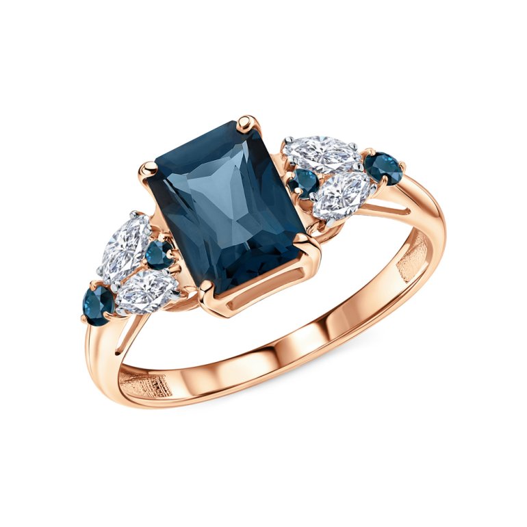 Кольцо с 1 топазом лондон природным, 1.86 карат, тип огранки Б; 4 сапфирами бесцветными природными, 0.37 карат, тип огранки Б; 2 топазами лондон природными, 0.085 карат, тип огранки В; 2 топазами лондон природными, 0.04 карат, тип огранки В; Розовое золото 585 пробы.