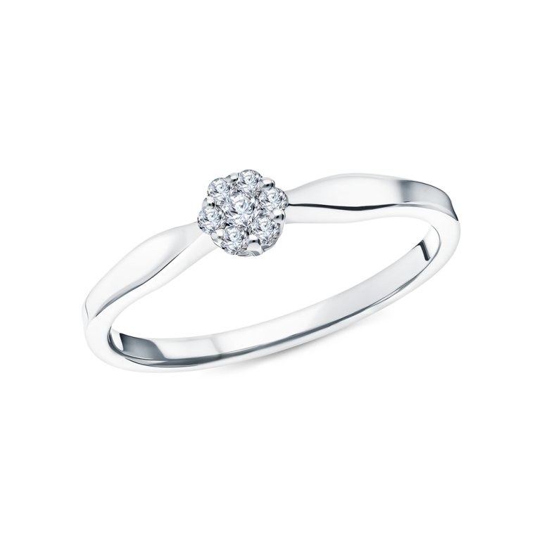 Кольцо с 1 бриллиантом, 0.026 карат, огранка круг 57 граней, цвет 3, чистота 6, тип огранки А; 6 бриллиантами, 0.065 карат, огранка круг 57 граней, цвет 3, чистота 6, тип огранки А; Белое золото 585 пробы.