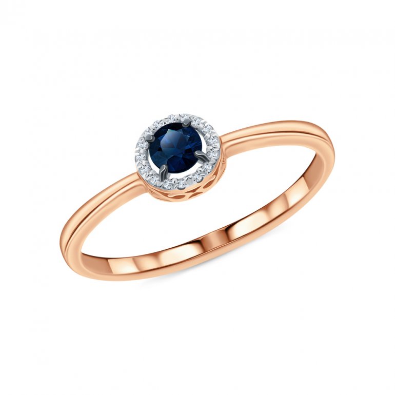 Кольцо с 1 сапфиром, 0.276 карат, цвет 2, чистота 2, тип огранки В; 16 бриллиантами, 0.034 карат, огранка круг 17 граней, цвет 2, чистота 2, тип огранки А; Розовое золото 585 пробы.