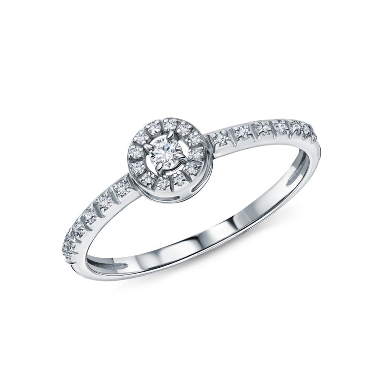 Кольцо с 1 бриллиантом природным, 0.04 карат, огранка круг 57 граней, цвет 3, чистота 6, тип огранки А; 12 бриллиантами природными, 0.049 карат, огранка круг 17 граней, цвет 2, чистота 2, тип огранки А; 12 бриллиантами природными, 0.029 карат, огранка круг 17 граней, цвет 2, чистота 2, тип огранки А; Белое золото 585 пробы.