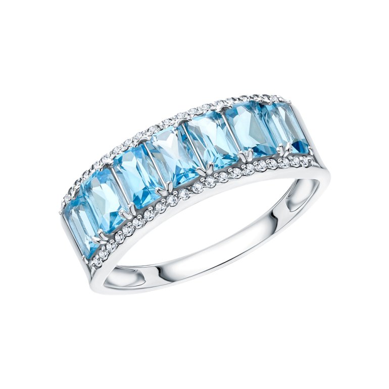Кольцо с 7 топазами свисс природными, 2.145 карат, тип огранки Б; 40 бриллиантами, 0.125 карат, огранка круг 17 граней, цвет 2, чистота 2, тип огранки А; Белое золото 585 пробы.