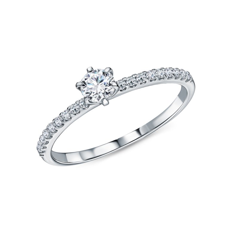 Кольцо с 1 бриллиантом природным, 0.234 карат, огранка круг 57 граней, цвет 3, чистота 6, тип огранки А; 18 бриллиантами природными, 0.107 карат, огранка круг 57 граней, цвет 3, чистота 6, тип огранки А; Белое золото 585 пробы.