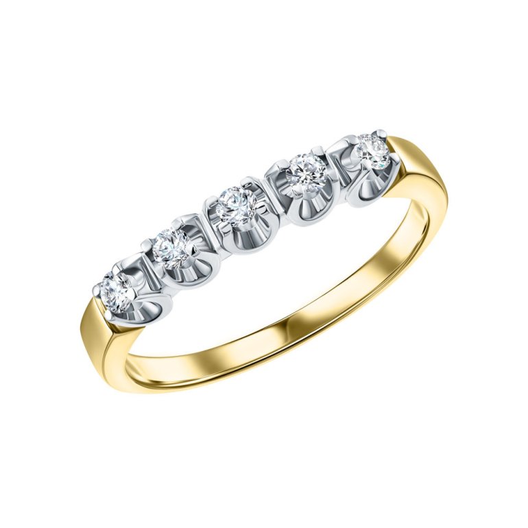 Кольцо с 5 бриллиантами природными, 0.185 карат, огранка круг 57 граней, цвет 3, чистота 6, тип огранки А; Желтое золото 585 пробы.