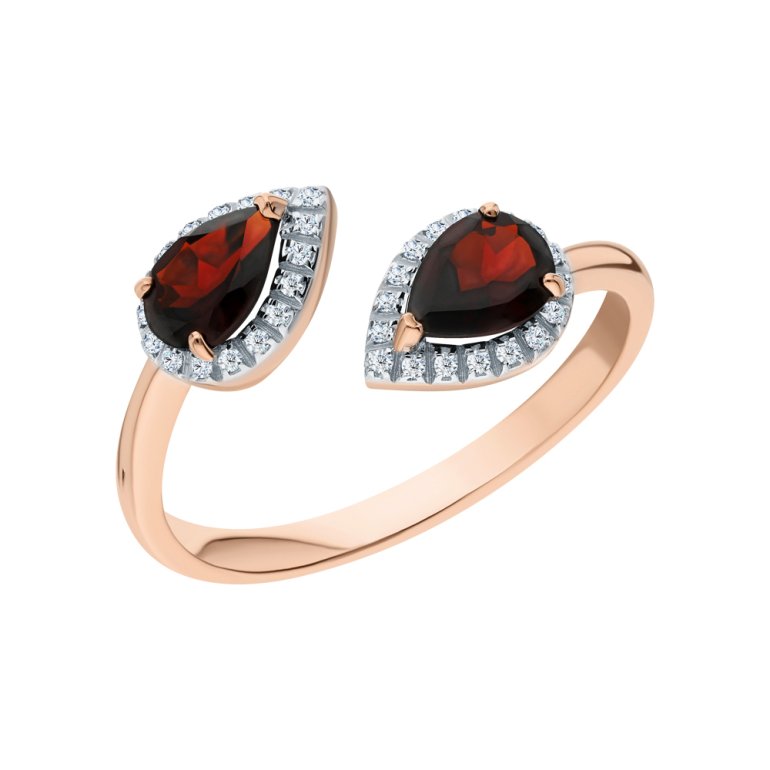 Кольцо с 34 бриллиантами природными, 0.14 карат, огранка круг 17 граней, цвет 2, чистота 2, тип огранки А; 2 гранатами природными, 1.506 карат, тип огранки Б; Розовое золото 585 пробы.