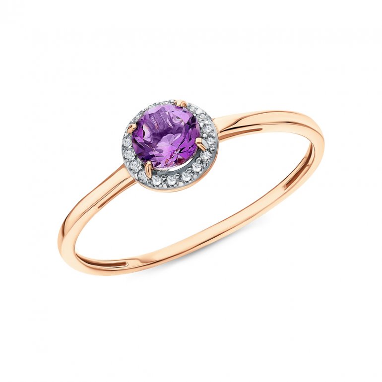 Кольцо с 1 аметистом природным, 0.45 карат, тип огранки В; фианитом бесцветным; Розовое золото 585 пробы.