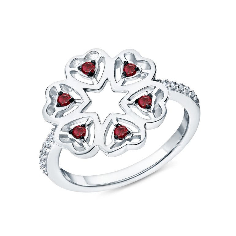Кольцо с 6 рубинами природными, 0.1 карат, цвет 3, чистота 4, тип огранки В; фианитом бесцветным; Серебро 925 пробы.