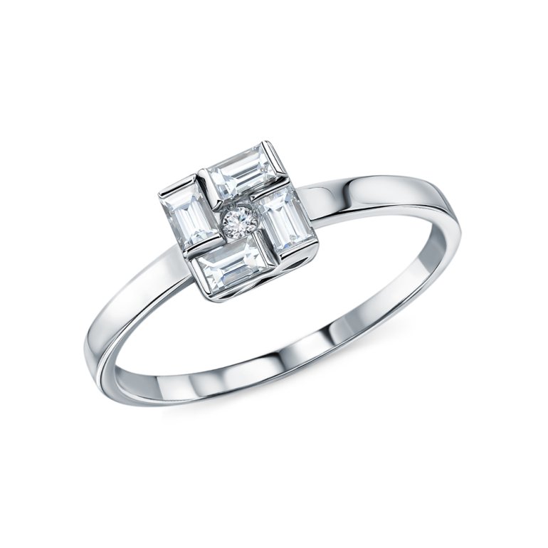 Кольцо с 4 бриллиантами природными, 0.32 карат, огранка багет 25 граней, цвет 3, чистота 3, тип огранки А; 1 бриллиантом природным, 0.013 карат, огранка круг 57 граней, цвет 3, чистота 6, тип огранки А; Белое золото 585 пробы.