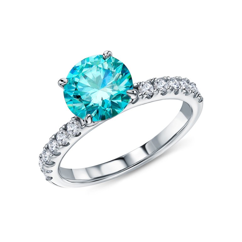 Кольцо с 1 муассанитом параиба, 1.725 карат; 14 муассанитами, 1.75 карат; Серебро 925 пробы.