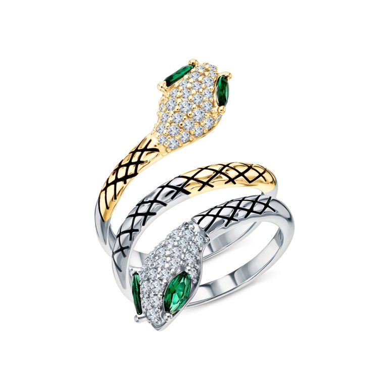 Кольцо, вставка: фианитом бесцветным;  фианит зеленый;  эмаль черная; Серебро 925 пробы.
