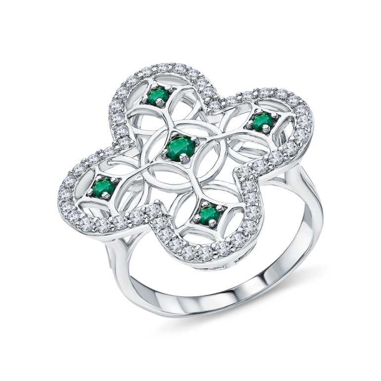 Кольцо с 5 агатами зелеными природными, 0.18 карат;  фианитом бесцветным; Серебро 925 пробы.