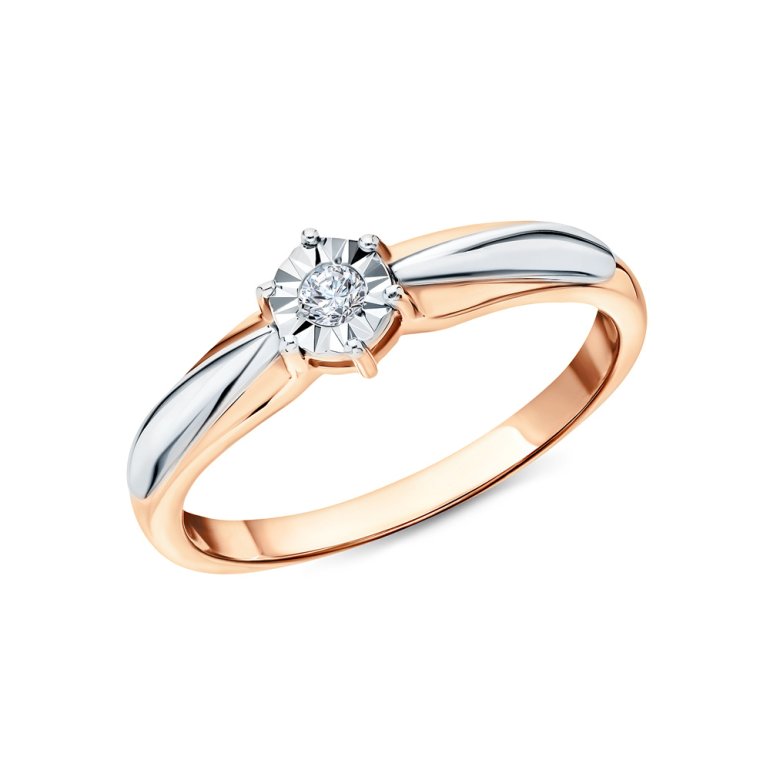 Кольцо с 1 бриллиантом природным, 0.038 карат, огранка круг 57 граней, цвет 3, чистота 6, тип огранки А; Розовое и белое золото 585 пробы.