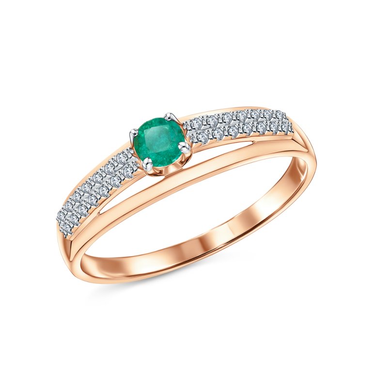 Кольцо с 28 бриллиантами природными, 0.073 карат, огранка круг 17 граней, цвет 2, чистота 2, тип огранки Б; 1 изумрудом природным, 0.146 карат, цвет 3, чистота 3, тип огранки В; Розовое золото 585 пробы.