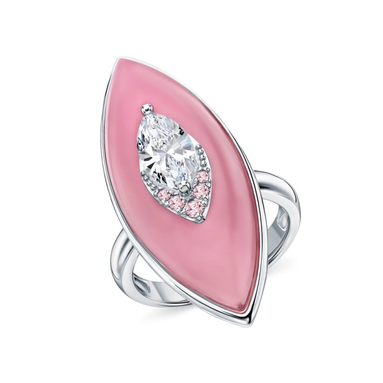 Кольцо с 1 горным хрусталем природным, 0.95 карат; 1 халцедоном розовым;  фианит розовый; Серебро 925 пробы.