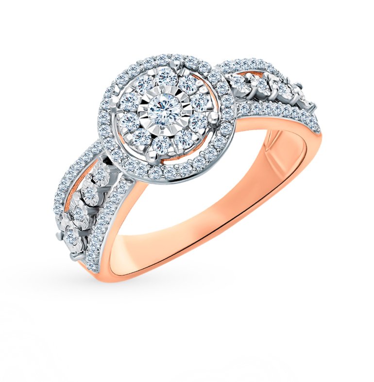 Кольцо с 1 бриллиантом природным, 0.058 карат, огранка круг 57 граней, цвет 4, чистота 6, тип огранки А; 2 бриллиантами природными, 0.023 карат, огранка круг 57 граней, цвет 4, чистота 6, тип огранки А; 12 бриллиантами природными, 0.107 карат, огранка круг 57 граней, цвет 4, чистота 6, тип огранки А; 70 бриллиантами природными, 0.215 карат, огранка круг 17 граней, цвет 2, чистота 2, тип огранки А; Розовое и белое золото 585 пробы.