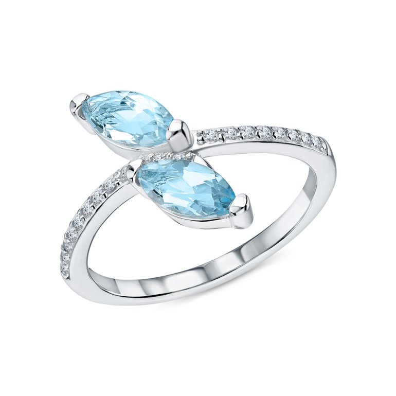 Кольцо с 2 топазами скай природными, 1.4 карат;  фианитом бесцветным; Серебро 925 пробы.