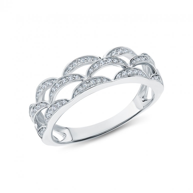 Кольцо с 44 бриллиантами, 0.149 карат, огранка круг 17 граней, цвет 2, чистота 2, тип огранки А; 24 бриллиантами, 0.049 карат, огранка круг 17 граней, цвет 2, чистота 2, тип огранки А; Белое золото 585 пробы.