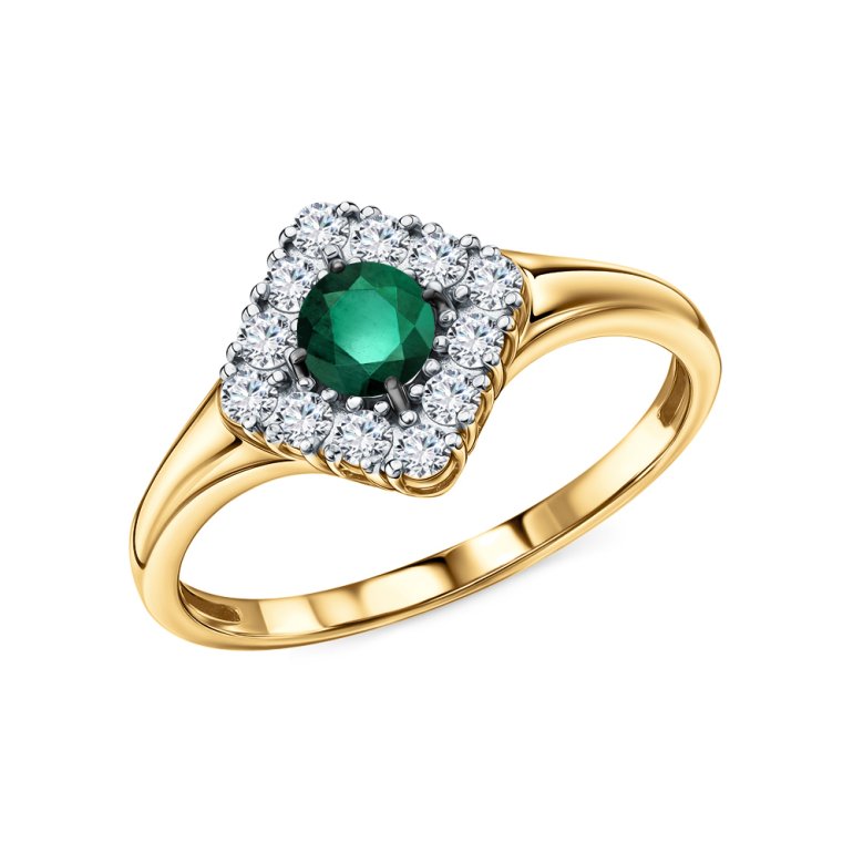 Кольцо с 1 изумрудом природным, 0.238 карат, цвет 3, чистота 3, тип огранки В; 12 бриллиантами, 0.27 карат, огранка круг 57 граней, цвет 3, чистота 6, тип огранки А; Желтое золото 585 пробы.