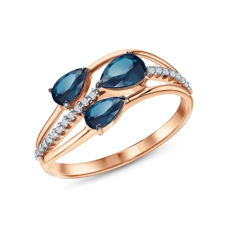 Кольцо с 1 топазом лондон, 0.385 карат, тип огранки Б; 2 топазами лондон, 0.54 карат, тип огранки Б; фианитом бесцветным; золото 585 пробы.