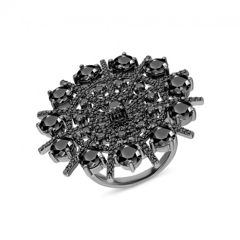 Кольцо с 23 шпинелями черными природными, 6.03 карат;  черным фианитом; Серебро 925 пробы.