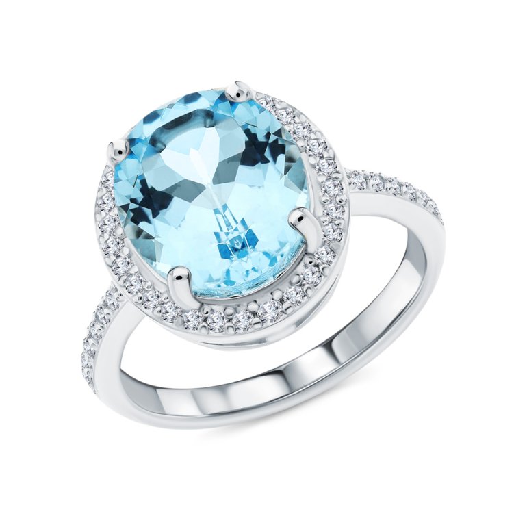 Кольцо с 1 топазом скай природным, 5.65 карат;  фианитом бесцветным; Серебро 925 пробы.