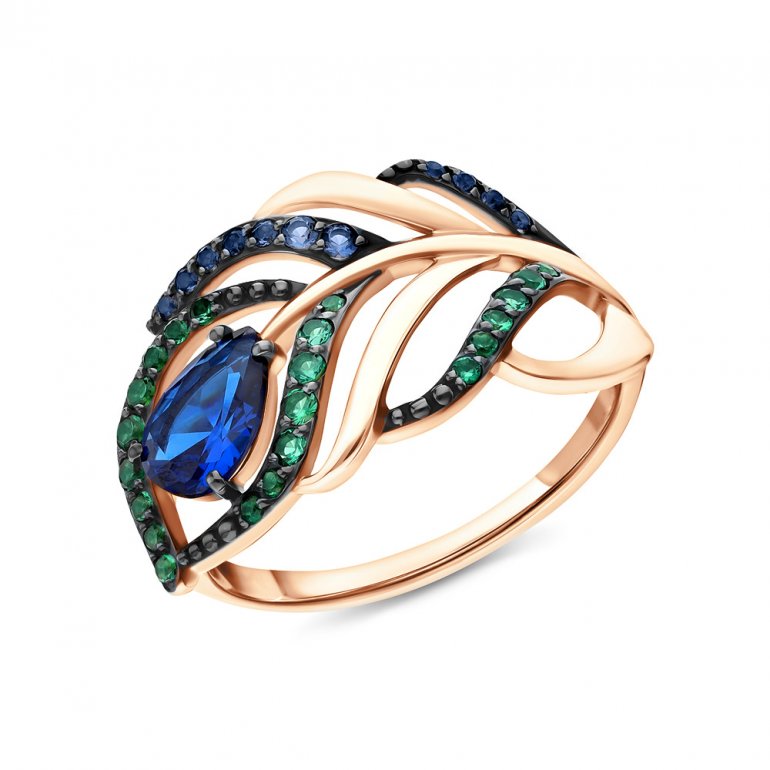 Кольцо, вставка: фианит зеленый;  фианит синий; Розовое золото 585 пробы.