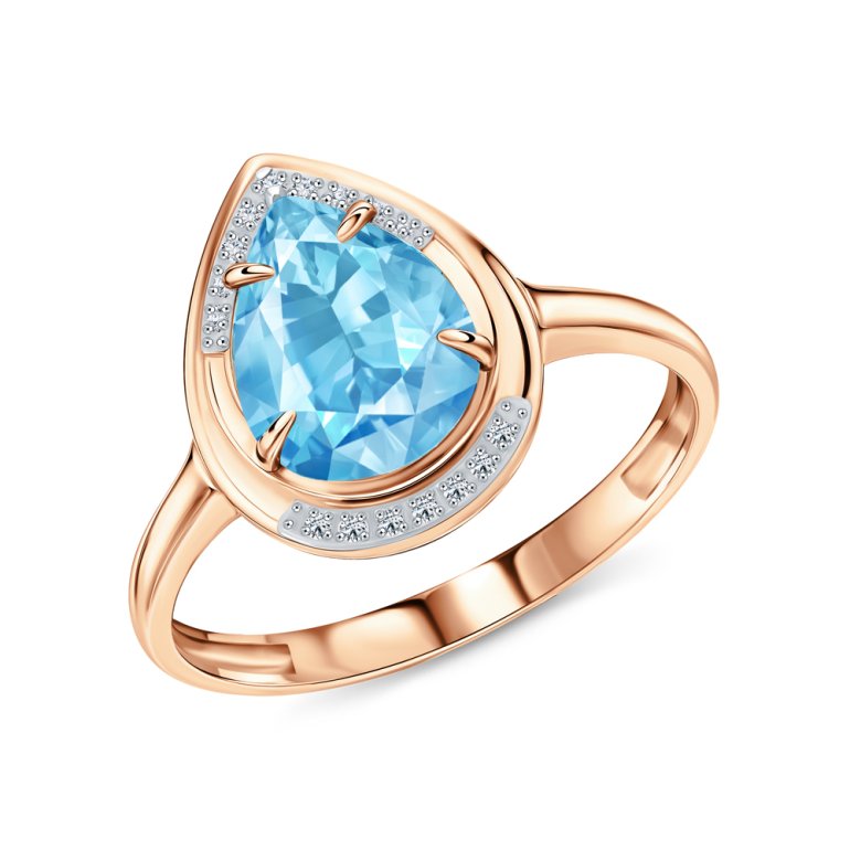 Кольцо с 16 бриллиантами природными, 0.038 карат, огранка круг 17 граней, цвет 2, чистота 2, тип огранки А; 1 топазом скай природным, 1.897 карат, тип огранки Б; Розовое золото 585 пробы.
