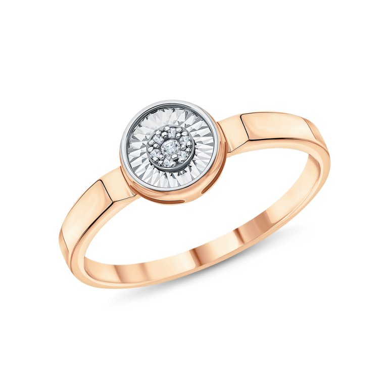 Кольцо с 1 бриллиантом природным, 0.007 карат, огранка круг 57 граней, цвет 3, чистота 6, тип огранки А; 6 бриллиантами природными, 0.011 карат, огранка круг 17 граней, цвет 2, чистота 2, тип огранки А; Розовое и белое золото 585 пробы.