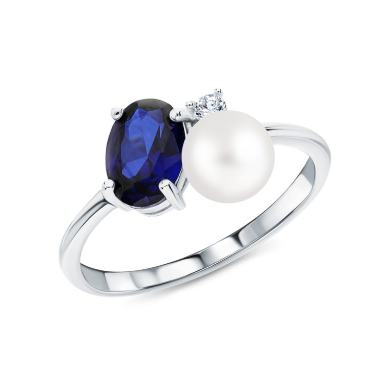 Кольцо с 1 жемчугом пресноводным культивированным белым; 1 корундом синтетическим синим;  фианитом бесцветным; Серебро 925 пробы.
