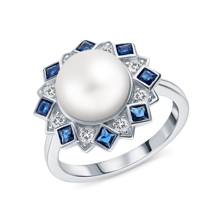 Кольцо, вставка: фианитом бесцветным;  фианит синий;  жемчуг культивированный белый; Серебро 925 пробы.